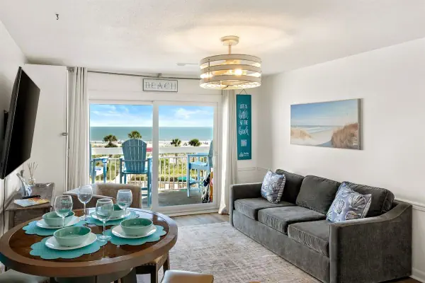 Breakers 324 is a beautifully updated oceanfront Hilton Head condo that sleeps 6. Features include a luxury king bed, bunk beds for 2 children, and a comfortable sleeper sofa for 2. Enjoy direct beach views, a fully stocked kitchen, dining for six, smart TVs, fast Wi-Fi, modern bathroom, and private washer/dryer. Located steps from Coligny Beach, Direct Beach Access, shops, dining, and bike paths—perfect for families and couples seeking a relaxing beachfront vacation.