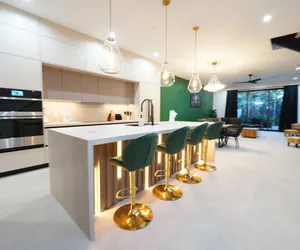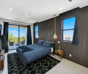 Welcome to your tropical escape, where vibrant jungle vibes blend seamlessly with modern elegance. Upstairs, you’ll find three spacious bedrooms, each with its own private en-suite. Downstairs, the living area features a queen pull-out sofa, and the loft offers a comfy futon for extra guests.