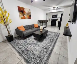 ⭐ Stylish and comfortable living room - wifi TV equipped with Roku so you can login/stream from your favorite services. The couch serves as an optional futon to sleep 🛏️ an additional 1-2 guest.