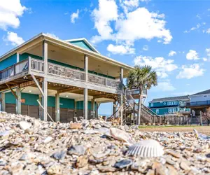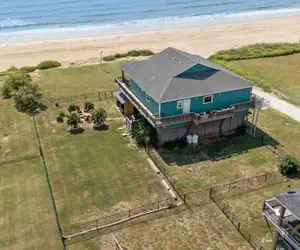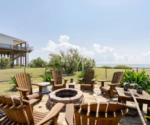 Right on the sand, this beach house welcomes you with three bedrooms, one king, one queen, and a bunk room. The kitchen is stocked for any feast, the tub deep for long soaks. An indoor electric fireplace warms cool nights, while the fire pit and grill call you outdoors. There’s seating for sunset, a generator for storms, and the tide itself for company and close enough to hear, near enough to touch.
