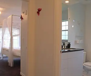 The next bedroom has a queen-sized bed with a flat-screen TV and a full bathroom that also has pool access. The third bedroom has a full-sized bed and a share the bathroom with the fourth bedroom, that has two twin beds.