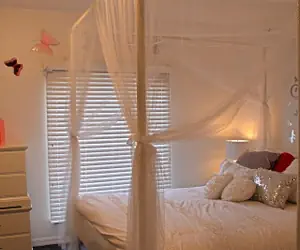 The four bedrooms in this vacation rental provide the perfect space to relax and get a restful night's sleep. The master bedroom, located at the east side of the living room, features two queen beds, dressed in luxurious bedding. It also has an en-suite bathroom with shower and garden tub.