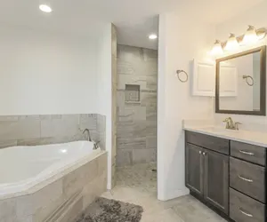 The primary bedroom features a king-sized bed with luxurious bedding, a private ensuite bathroom, a flat-screen TV, and a ceiling fan. The second bedroom includes a queen bed, while the third bedroom offers two comfortable beds ideal for kids or additional guests. Guests have full access to the entire home, with the exception of a locked owner’s storage room. There is a car parked in the garage, but guests are welcome to use the garage space.