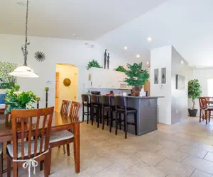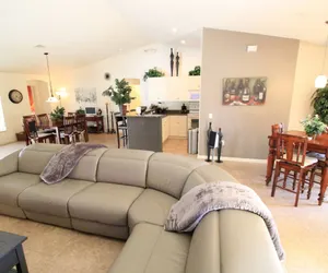 Gather around the dining table and enjoy the laughter and togetherness that come with sharing meals as a family. The fully equipped kitchen makes meal prep a breeze, complete with a full-sized refrigerator, microwave, range with oven, and a coffee maker — everything you need to feel right at home.