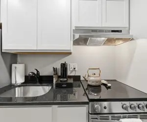Whip up your favorite meals in the well-appointed kitchenette, fully stocked with dishware, cookware, and all the essentials. Whether you're working remotely or simply catching up on emails, the dedicated workspace and Smart TV (which can function as a computer monitor) provide a seamless, productive setup. A full bathroom with a relaxing tub/shower combo completes the space, offering everything you need to unwind after a busy day.