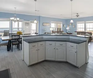 The house is simple and made for days by the water. There is a wide room where the kitchen, table, and chairs all run together, so the cooking and talk do not have to stop. Three bedrooms wait at the end of the day, and two baths with hot showers to take the salt and sand away. Under the house there is shade, chairs, a charcoal grill, horseshoes, and an outdoor shower so you can come up from the beach and never mind the sand.