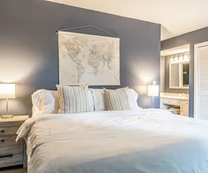 The primary suite features a private en suite bathroom and a serene place to unwind after a full day out. The second bedroom offers two twin beds, making it ideal for friends, children, or additional guests. A washer and dryer are located in the unit for added ease during your stay.