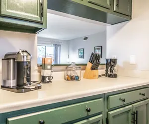 Tucked among mature trees, this corner unit feels peaceful and secluded, creating the perfect balance between nature and convenience. Inside, the space is bright and inviting, with playful green cabinetry that adds character while still feeling elevated and cohesive.