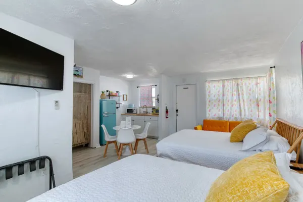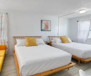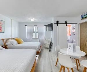 You’ll love the stylish decor of this charming place to stay. You will be close to everything at The Pineapple Shores Motel. The unit was recently fully renovated and includes an adorable kitchenette, 2 queen beds and a small futon that could sleep a child. Motel is located in Daytona Shores across from the beach and comes fully stocked. Enjoy quintessential Florida at this retro inn that is a throw back to the 50's when Daytona Beach hit the scene. Non-aggressive dogs allowed with pet fee.