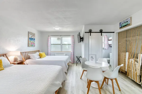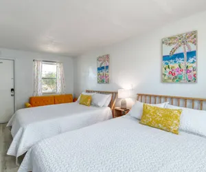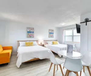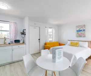 You’ll love the stylish decor of this charming place to stay. You will be close to everything at The Pineapple Shores Motel. The unit was recently fully renovated and includes an adorable kitchenette, 2 queen beds and a small futon that could sleep a child. Motel is located in Daytona Shores across from the beach and comes fully stocked. Enjoy quintessential Florida at this retro inn that is a throw back to the 50's when Daytona Beach hit the scene. Non-aggressive dogs allowed with pet fee.