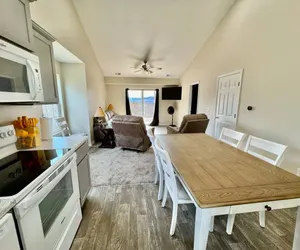The condo features a King sized bed in the master bedroom with an ensuite bathroom. The secondary bedroom has a queen bed. The living room sofa has a sofa bed. The kitchen is fully stocked to make a great meal. Relax and take in the great views on the huge. deck. The community amenities such as the pool and playground are just a short walk down the hill.
