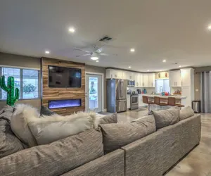 This home has been fully recently remodeled with a one-of-a-kind modern look and function. This single story home features air conditioning, privacy faux wood blinds, sparkling quartz countertops in both the kitchen and bathrooms. Mirrors galore to make sure that you look amazing for your night on the town! The open kitchen also features bar seating, stainless steel appliances, pots, pans, utensils, blender, coffee maker, french press, toaster and much more! The inviting family room is spacious and functional, with plentiful seating, soft carpeting, a 60" TV, DirecTV, ceiling fan, and even an assortment of board games for your enjoyment. Each bathroom features modern vanities, and gorgeous sparkling quartz countertops.