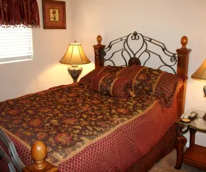 This beautiful 5 bedroom features tvs in all bedrooms; three bathrooms; a game room with poker table, foosball table, and darts; and also a private outdoor spa for relaxing. The upstairs loft has a sofa sleeper, as well as the living room which also has a sofa sleeper. The master bedroom features a private bathroom with separate shower and garden tub, as well as a private patio. The backyard has plenty of seating, a BBQ, spa, and fire pit. The kitchen has beautiful granite counter tops, and plenty of dishes and cookware for large groups. This home is the perfect choice for groups of up to 10.