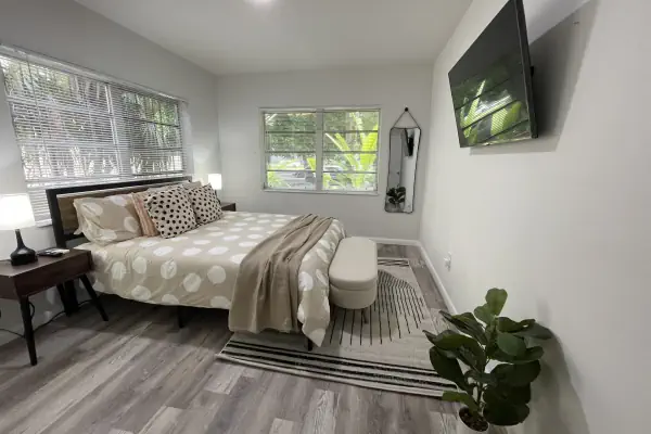 Equipped with all you need for your stay. Kitchen with full utensils, wifi, smart tv, shared washer&dryer, linen, towels, etc. Parking spot available on premises.