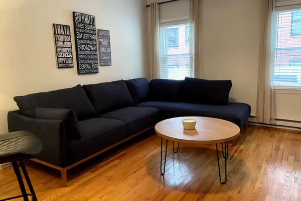 The main living area features a modern sectional sofa on a hardwood floor, creating a perfect spot to relax after a day of exploring. With two bedrooms and a supplementary queen-size air mattress, the condo comfortably accommodates up to six guests.