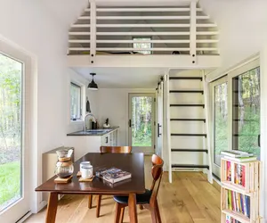 Inside, the main floor features a cozy sitting area, compact kitchen with a mini fridge (small freezer compartment), dining table, and wet-room style bathroom where the shower and toilet share the same space—efficient and true to tiny-home living. Climb the ladder to a lofted bedroom with a plush mattress and tranquil treetop views.