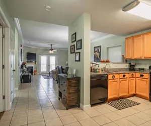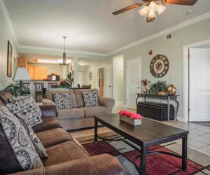 Each bedroom is equipped with a TV and a ceiling fan, ensuring comfort and entertainment. The living area hosts a generous flat screen TV, positioned in front of ample seating for your family. With two full bathrooms, including a master with a garden tub and shower, you'll find comfort and convenience.