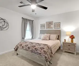 The bedrooms, each featuring a plush queen-sized bed, offer a quiet retreat with subtle hints of yesteryears. Look closely and you'll find retro-inspired lamps, vintage patterned rugs and bedspreads, and classic wall art that adds a touch of whimsy and character to each room. The fully equipped bathrooms feature modern fixtures with touches of retro charm, such as vintage-inspired art and shower curtains.