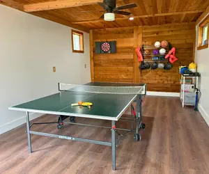 The kitchen boasts a large island where everyone can gather and offers everything you need to whip up a great-tasting meal or bake some goodies! With items like a Keurig, coffee maker, crockpot, Vitamix Blender, KitchenAid stand mixer, toaster, cooking essentials, cookie sheets, baking pans, and more, you will have everything you need but the ingredients! There is also plenty of seating around the dining table, island, and the adorable kiddo table (the crayons and chalkboard are a huge hit, too!)