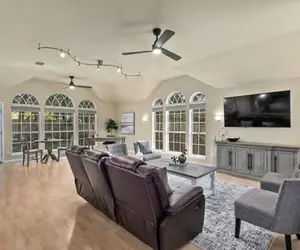 The one-story home offers large living, dining, and kitchen areas as well as 4 spacious bedrooms boasting three queen-sized beds and a king-sized bed in the primary bedroom, which is tucked away from the rest of the house.