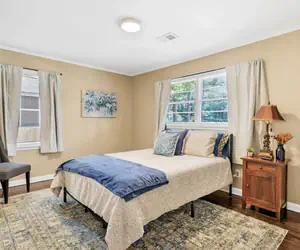 The home boasts two beautifully designed queen bedrooms, each offering a plush queen-sized bed dressed in soft, high-quality linens to ensure a restful night’s sleep. Both bedrooms are equipped with ample closet space, bedside lamps for late-night reading, and thoughtful touches like artwork and decor that create a welcoming ambiance. Large windows in these rooms provide lovely views of the neighborhood.