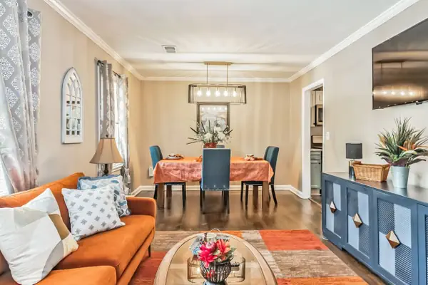 As you enter the home, you're greeted by an inviting living room that serves as the heart of the house. This spacious area features comfortable seating, perfect for unwinding after a day of exploring Atlanta. The large windows flood the room with natural light, creating a warm and cozy atmosphere. You’ll find a Roku smart TV with streaming capabilities, so you can kick back and watch your favorite shows or movies. Stylish decor and tasteful art add a touch of personality, making this space ideal for both relaxation and gathering.
