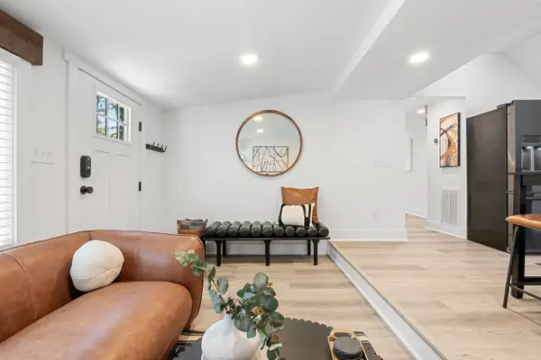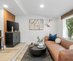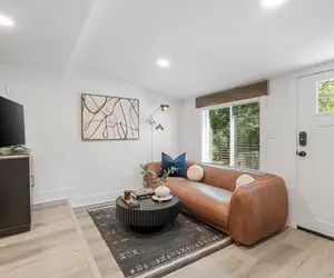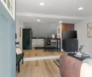 Unit C, nicknamed 'Slate', is a two-bedroom, one-bathroom apartment located on the back of the main residence and accessible by a flight of stairs. The two bedrooms, one with a queen bed and the other with a king, are thoughtfully designed for relaxation, complete with plush bedding, sound machines, ample hangers and luggage racks for ease of traveling. The desk in the second bedroom is perfectly set up for remote work, with a comfortable chair, ample lighting, and a quiet, focused atmosphere.
