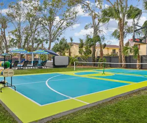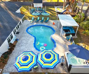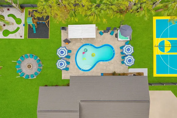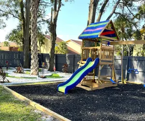 Luxurious and inviting retreat! This stylish home combines comfort with fun, offering three spacious king-sized beds and a unique bunk bed, making it ideal for families and groups. Gather around the firepit or relax in the hot tub. Game room with air hockey and arcade games, outdoor dining, and a playground. Pickleball/basketball court, mini-golf, pool. Fully stocked with essentials, a high chair, and dog bowls, this getaway has everything for a memorable Tampa stay!