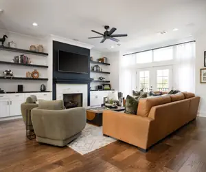 The living room is designed for comfort, with a large leather sectional, two swivel chairs, and a plush lounging chair with an ottoman, all centered around the cozy gas fireplace. Above the fireplace, a 75" smart TV with surround sound creates the ultimate setup for movie nights or watching the big game. Conveniently, a half bath is located just off the living room.