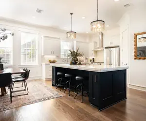 The heart of the home is on the second floor, where the open-concept living, dining, and kitchen spaces create a luxurious setting for relaxation and entertaining. The fully stocked kitchen is a chef’s dream, featuring top-of-the-line KitchenAid appliances, a gas range, a large 50/50 sink, and an 8-foot island with seating for 3 at the bar. Prepare meals effortlessly while friends or family gather around the expansive dining table, which comfortably seats 8.