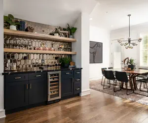 For those who love to entertain, the bar area is outfitted with wine glasses, martini essentials, and a wine/drink refrigerator, ideal for crafting the perfect cocktail or enjoying a chilled glass of wine.