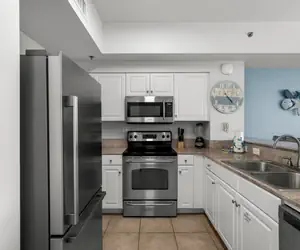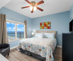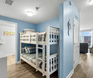 Enjoy your vacation in this beautifully furnished beach condo, where everything you need is just steps away. The spacious living area invites you to kick back and relax with a large flat-screen TV and a cozy sofa. After a day of adventures, retreat to the king-sized bed, with built-in bunks offering extra sleeping space for up to six guests. The modern dining area is perfect for shared meals, while two full bathrooms with separate vanities provide plenty of space for everyone.