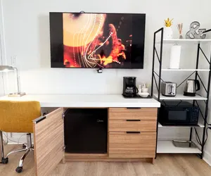 • Coffee maker, microwave, and a minibar fridge. For added convenience, the studio includes essential items such as towels and linens.