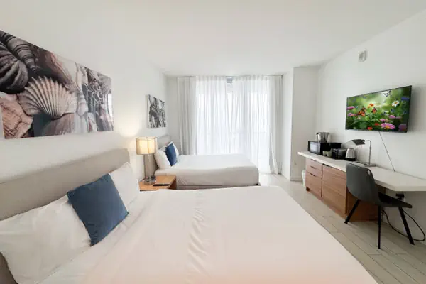 Welcome to your elegant and inviting studio apartment at Beachwalk in the heart of Hallandale Beach. This chic space promises a unique experience, ideally situated to immerse yourself in the lively local scene. This Studio features a bedroom with 2 full-size beds, 1 spacious bathroom, and private WiFi. Enjoy resort amenities like a pool, dining, and local attractions. Check-in at 4 PM, check-out at 11 AM. Perfect for relaxation or exploring Hallandale Beach.