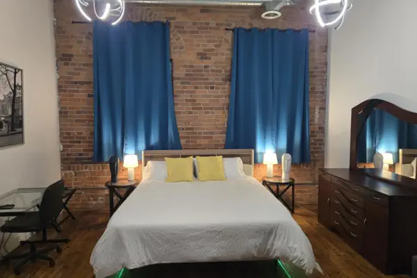 The Detroit Cadillac Studio Loft offers a cozy and inviting environment with a stylish open floor plan. This thoughtfully renovated space features a living room, dining area, and bedroom all interconnected, making it easy to relax or entertain. Large windows fill the area with natural light, creating a warm atmosphere.