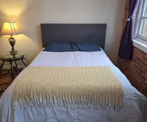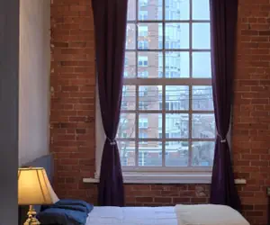 The bedroom area features a comfortable queen-sized bed with soft linens, providing a peaceful night's sleep. The space also includes a spacious closet for your belongings. With the large windows equipped with room-darkening drapes, you can enjoy a restful stay at any time of the day.