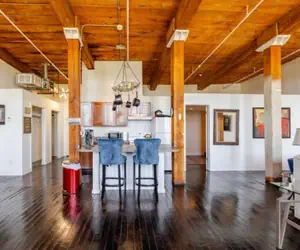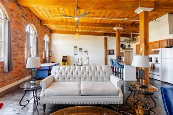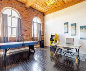 The Belle Isle Loft is a cozy retreat in Detroit, providing stunning views of Mt. Elliott Park and the Detroit Riverwalk. The open floor plan seamlessly combines the living room, dining area, and bedroom, making it a comfortable space to relax and unwind. With arcade games like Pacman and air hockey, there’s plenty of fun to be had during your stay.