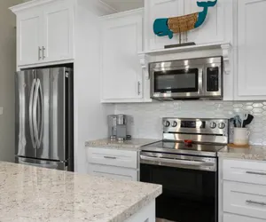 Two of the bedrooms feature two queen beds each, while the third boasts a king-sized bed in the master suite, complete with a spacious private bathroom. A second full bathroom is located in the hallway between the queen rooms, while the third bathroom is past the laundry room, providing easy access for everyone. Each room includes a smart TV for streaming.