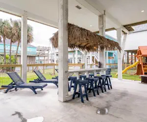 But there’s more to this place than the indoors. Step outside and experience the beach life. You can relax on the outdoor seating, listen to the waves and feel the breeze on the top deck. And if you’re in the mood for some grilling, you’ll love the long tiki bar and grilling area, where you can mingle and cook up some tasty treats.