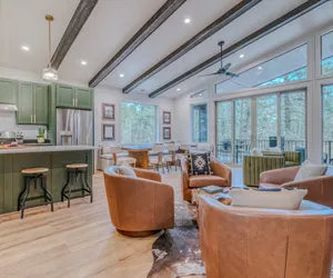 Inside, every detail is curated for comfort—from luxury linens and boutique décor to spacious king suites that give each guest privacy and relaxation. It’s the rare combination of riverfront serenity, walkable convenience, and high-end style that guests adore about this cabin.