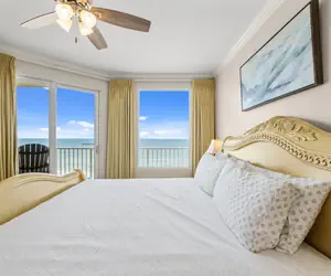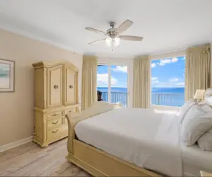 🛏️ Elegant Master Suite – Relax in a luxurious king-size bed with stunning Gulf views and private balcony access for the ultimate retreat.