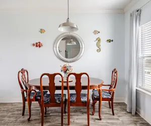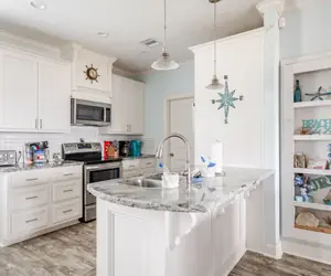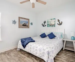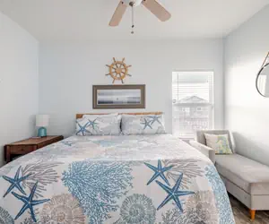 he primary bedroom features a spacious king bed with plenty of natural light. The second bedroom also has a king bed, making it perfect for couples or solo travelers seeking extra space. The third bedroom is designed for groups or kids, with two twin-over-full bunk beds. The house includes two full bathrooms with modern fixtures and tub-shower combos. The open living area has comfortable seating, a smart TV, and large windows that let in plenty of natural light. The fully equipped kitchen has everything you need to cook meals, with ample counter space and a large dining table for group gatherings. Outside, the huge deck offers plenty of seating and direct beach access, making it easy to enjoy the sand and surf just steps away.