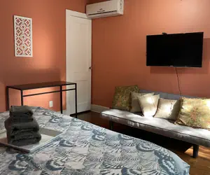 "Old Town Cincinnati" is the perfect blend of plush and artsy, with a King bed and a futon that can sleep a third person with permission. For light travelers we have convenient essentials for a nice shower in addition to our complimentary coffee and tea! Our simple room layout has a coffee table for two, Roku tv and tall table for luggage. If you’re in for its history, the sound of cargo trains hauling their locomotives through the night is just magical!
