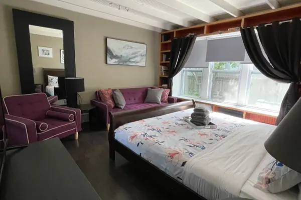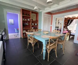 This comfortable king suite is located in a historic neighborhood and features a large eat-in kitchen with modern appliances. Amenities include a washer and dryer, mini closet making it ideal for longer stays. You'll love our digital guidebook for recommendations, simple room layout and nice walking location in a historic neighborhood. With a well equipped kitchen (without spices) coffee and tea are also provided. Internet TV with Hulu and Netflix is accessible through the Roku homepage.
