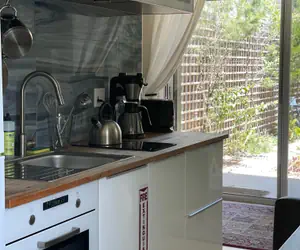 Enter through private gate next main house and walk through a shared garden to get to the glass doors (the carriage house).