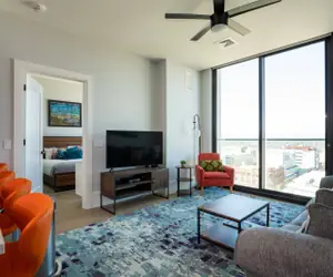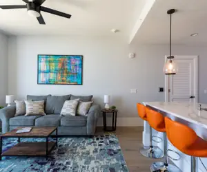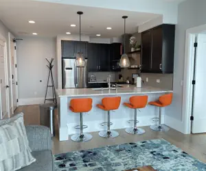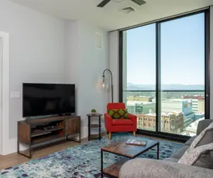 To help give you a taste of Asheville, we’ve stocked your coffee station with a small supply of local coffee and tea from Dynamite Roasting Co and Asheville Tea Company. The breakfast bar seats four, pleasant for working or dining with loved ones. The living room has a plush sleeper sofa that sleeps two and an additional accent chair. Mountain Day Dream is a dreamer's escape, perfect for watching the sunset with your favorite evening beverage beside a loved one. For entertainment, enjoy a 55” cable TV and 500+ Mbps high-speed Wi-Fi to stream your favorite binge-worthy shows. A picture-perfect scene to wake up to in the morning and wind down to in the evening, the sliding glass window in the living room opens up, ushering in fresh air and unbeatable unobstructed views of the city and mountains beyond.