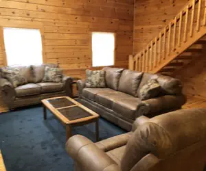 - The living room is the heart of the cabin, boasting a wood burning fireplace, perfect for cozy evenings in.