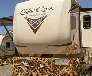 Driftwood is a 5th wheel RV with a spacious kitchen and living area, queen size beds, and high ceilings.