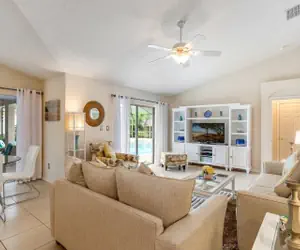 The main lounge area is very comfortable, and has a large Smart TV with Spectrum TV installed, and direct access to the pool deck.