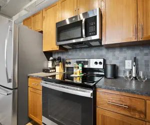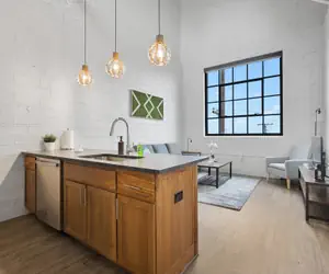 The exposed brick, industrial style windows, and open concept layout make for the perfect spot to capture your time at Superior in Insta-worthy shots. Off of the main living space, privacy and luxury collide in the spacious bathroom featuring earthy materials and a vibrant shower. Kick back on the couch and stream your favorite shows after a long day.